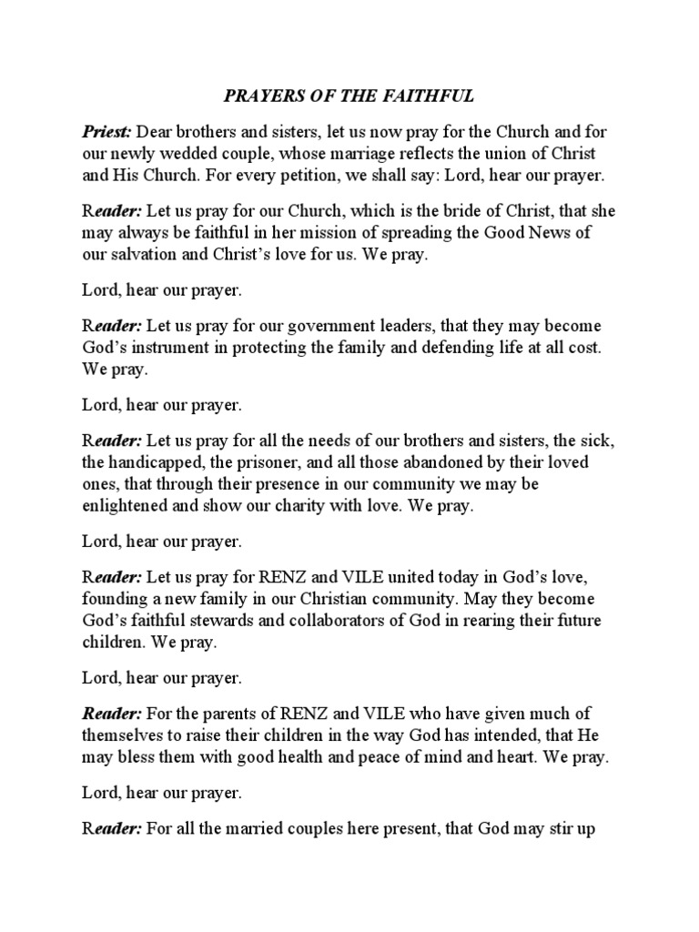 Learn about the origin, meaning and examples of prayers of the faithful, also known as universal. Find two examples of prayers of the faithful for weddings, with different themes and intentions. Learn how to write prayers that are reverent, relevant, and readable for the parish. Find a collection of prayers for the faithful to offer at the funeral mass of.